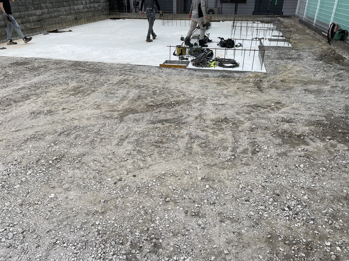 防湿シートを敷き詰めた後に、捨てコンクリート(略して捨コン)の打設を行いました。