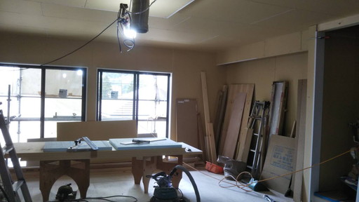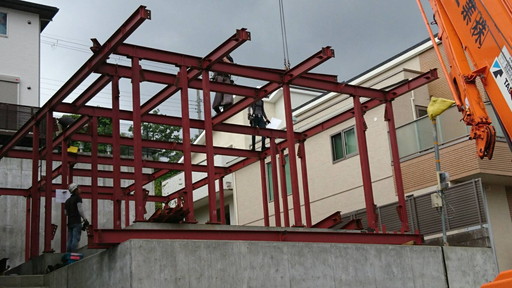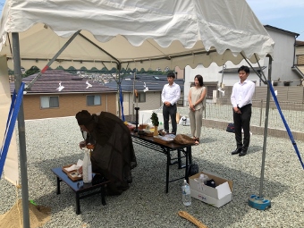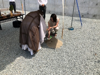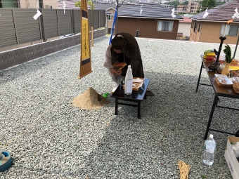 上棟式を行いました。神の守護に感謝し、同時に無事建設されることを祈願する儀式です。建物の四方に酒・塩・米をまいて清めました。