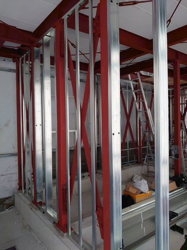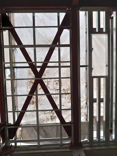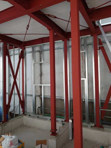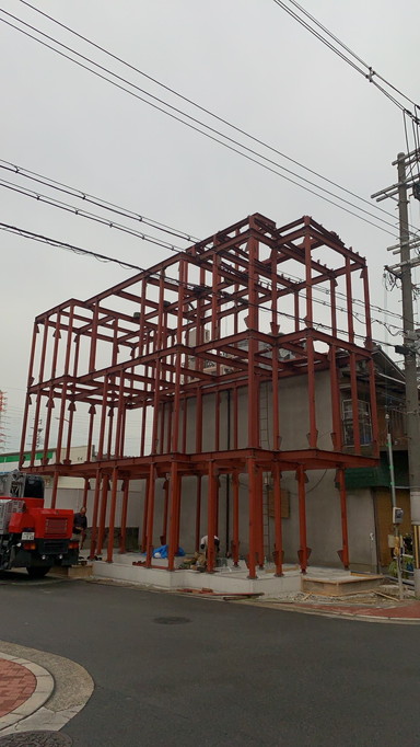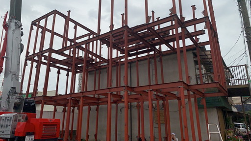 鉄骨を慎重にクレーンで吊り上げ、ハイテンションボルトでしっかりと締めつけます。