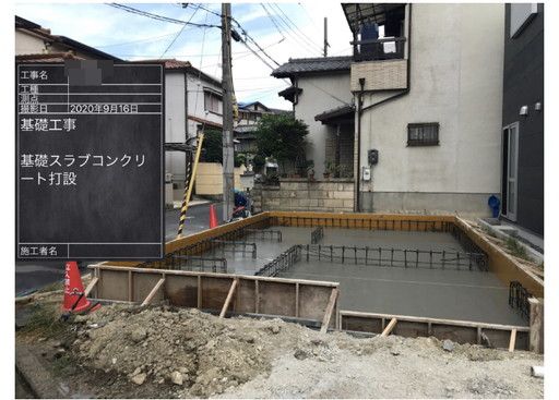 防湿シートを敷き詰めた後に、捨てコンクリート(略して捨てコン)の打設を行いました。