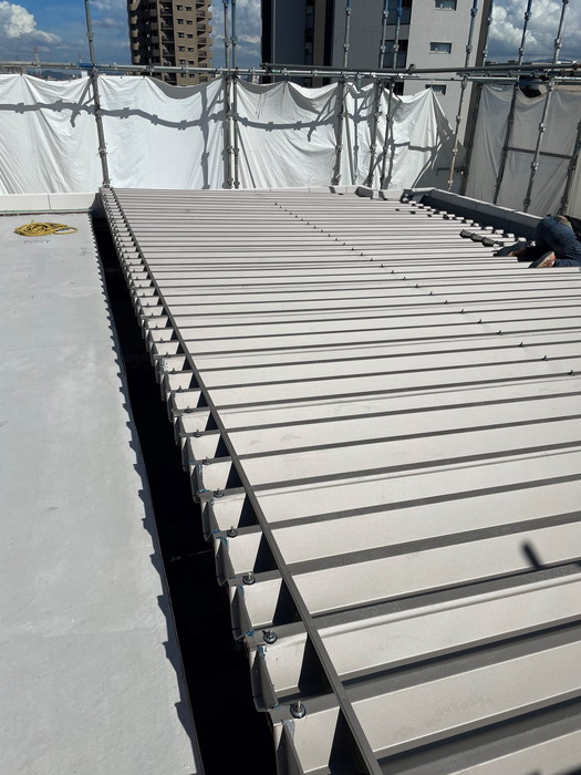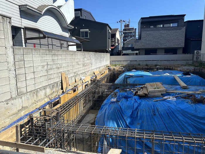 防湿シートを敷き詰めた後に、捨てコンクリート(略して捨てコン)の打設を行いました。