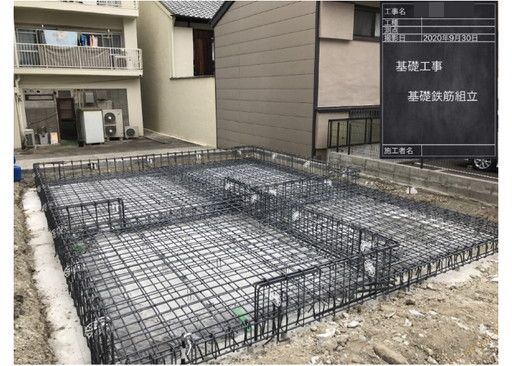 まず打設前に基礎の外周に沿って型枠を設置し、底盤部分のコンクリート打設を行います。 次に立上り部分にコンクリートを打設します。どちらのコンクリートも余計な空気や水分を抜いてしっかりと締め固めを行います。