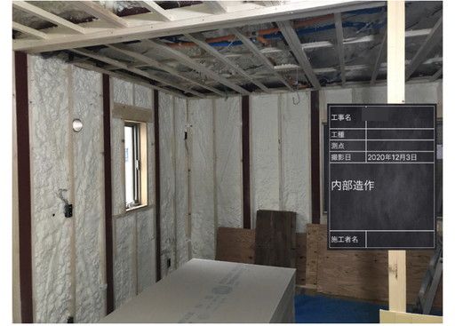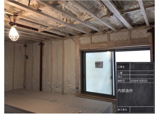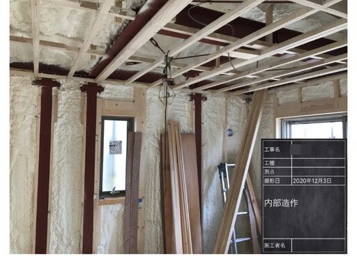 白いモコモコしたものが断熱材、現場発泡硬質ウレタンフォームです。