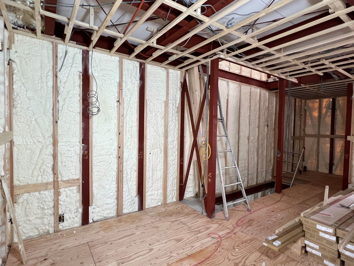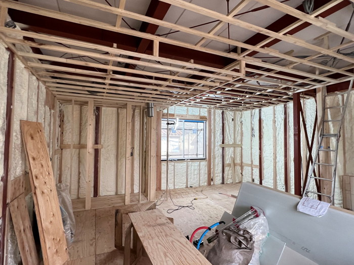 白いモコモコしたものが断熱材、現場発泡硬質ウレタンフォームです。