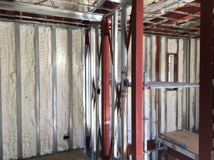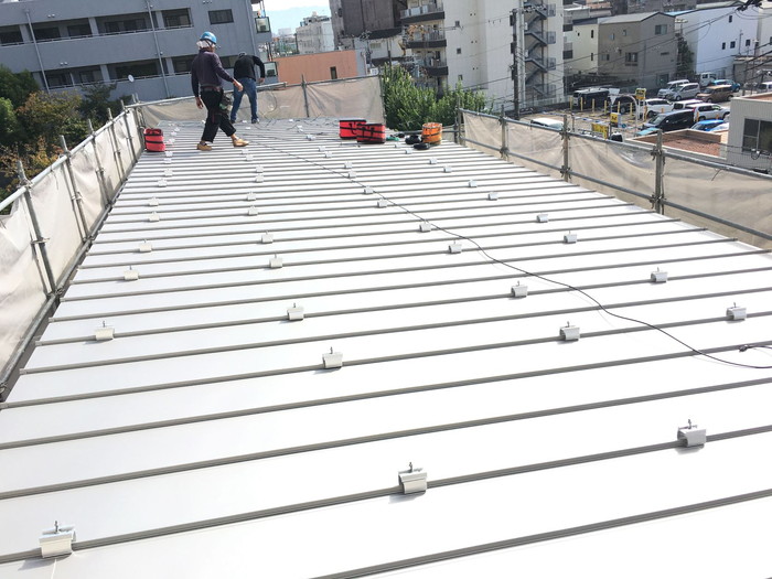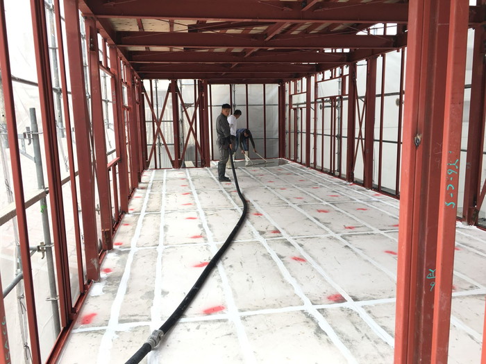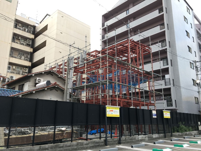 鉄骨を慎重にクレーンで吊り上げ、ハイテンションボルトでしっかりと締めつけます。