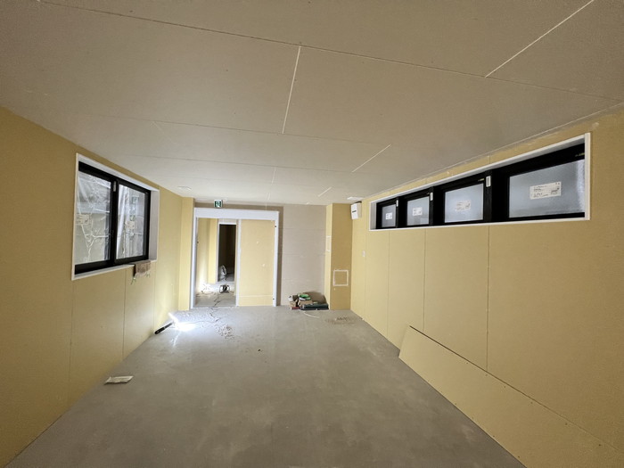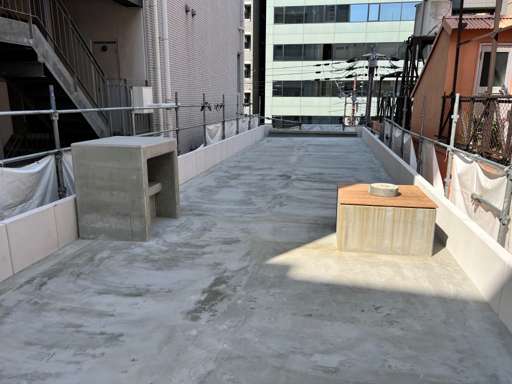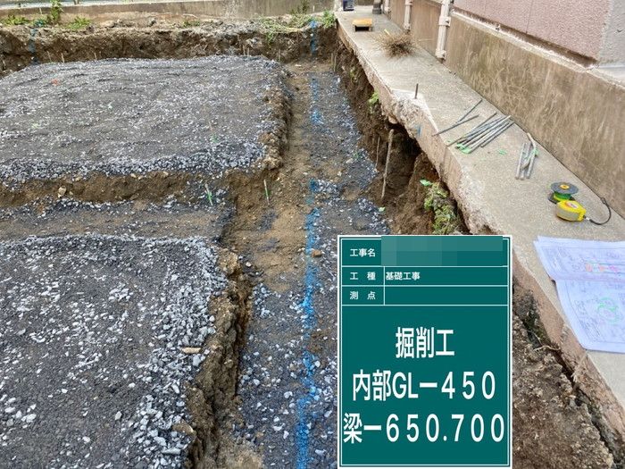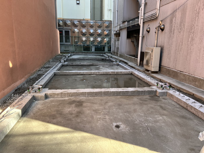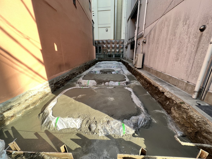 防湿シートを敷き詰めた後に、捨てコンクリート(略して捨てコン)の打設を行いました。