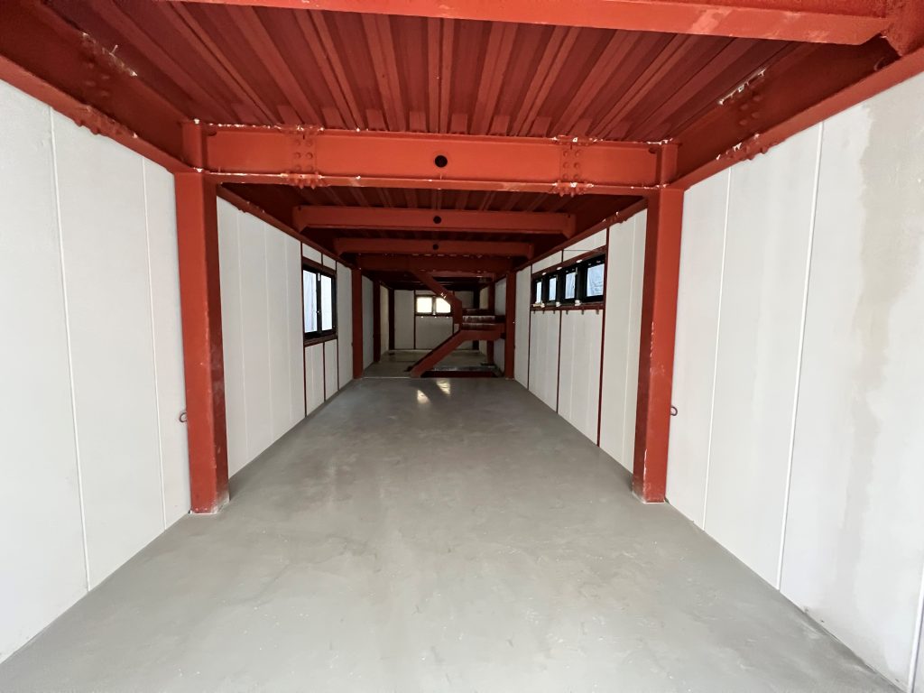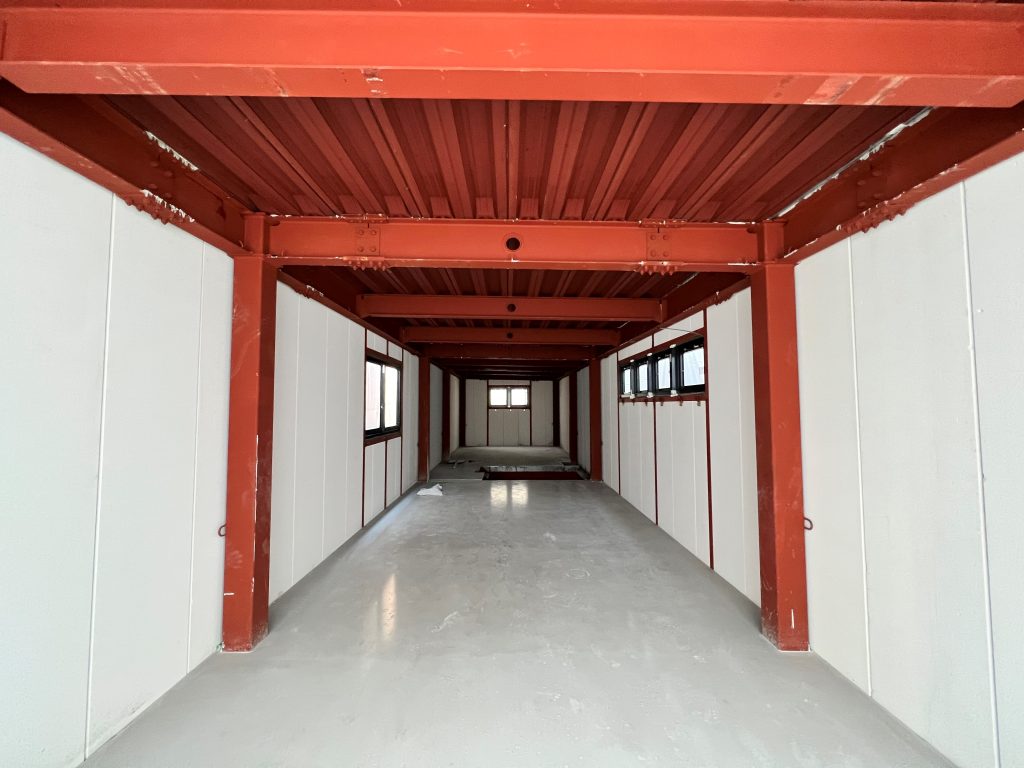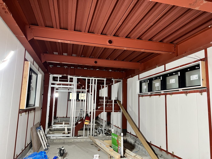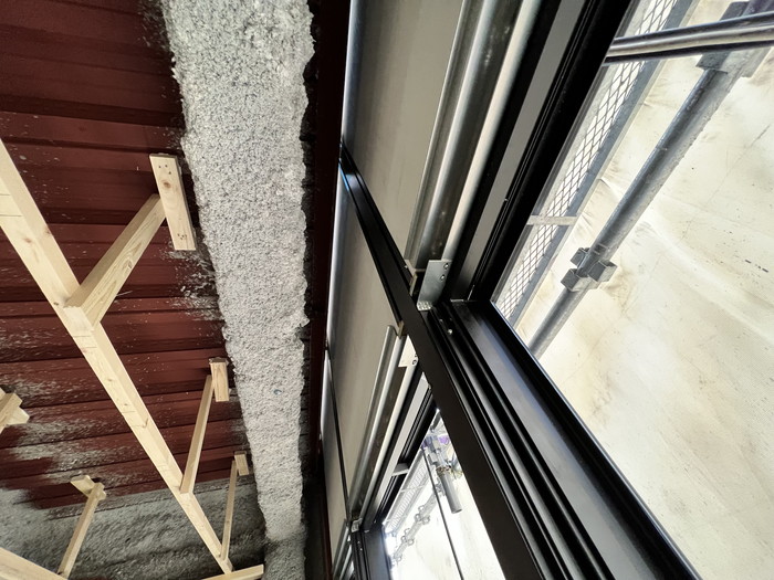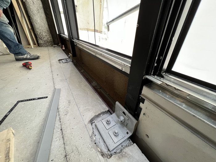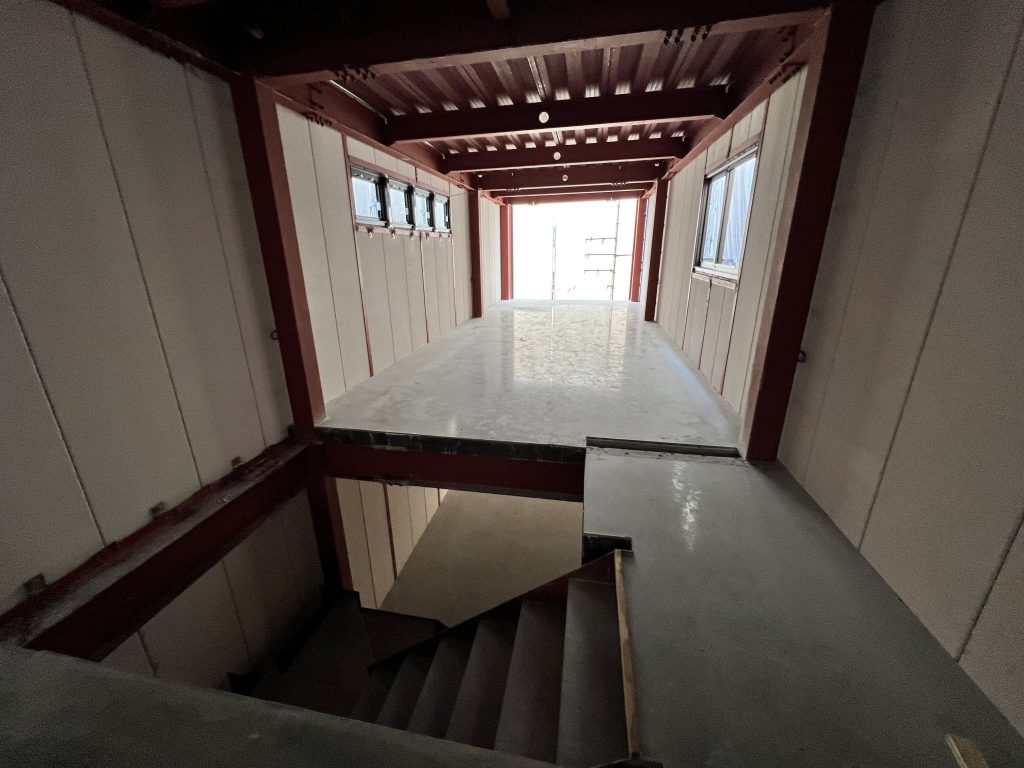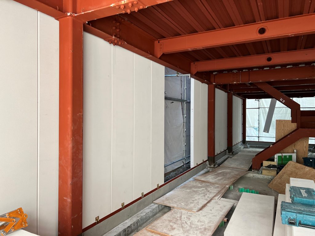 鉄骨を慎重にクレーンで吊り上げ、正確な取付け位置を確認しながらハイテンションボルトでしっかりと締めつけます。
