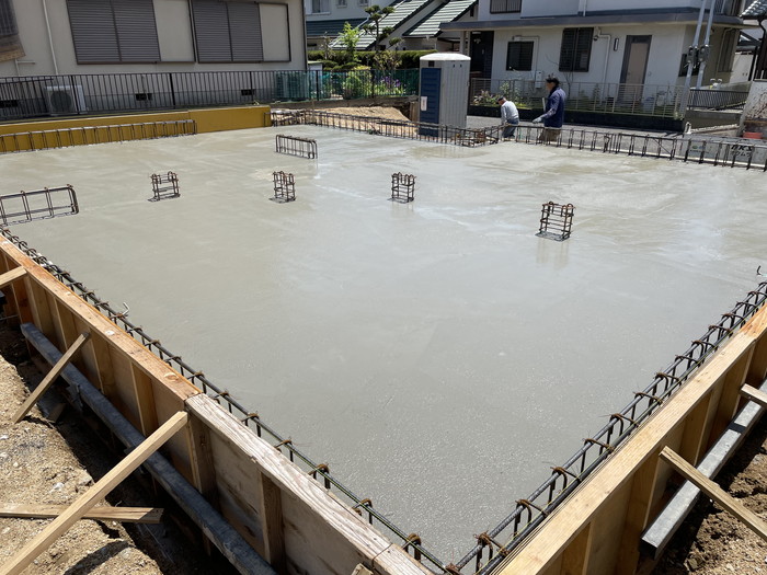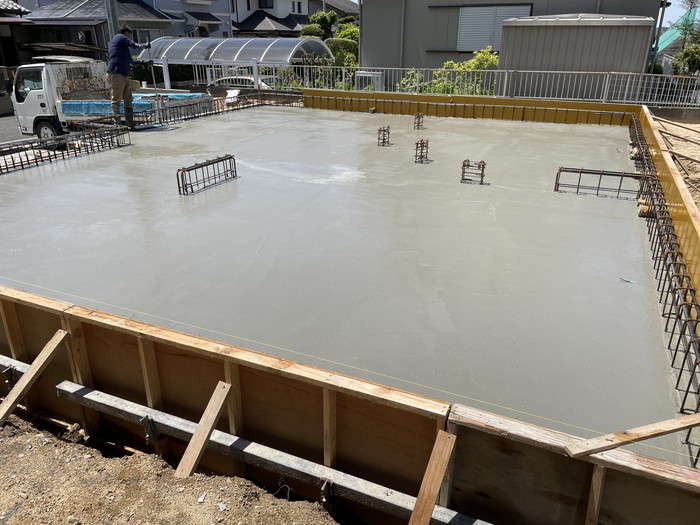 基礎配筋工事を行いました。べた基礎のダブル配筋になっていますので、とても丈夫です。