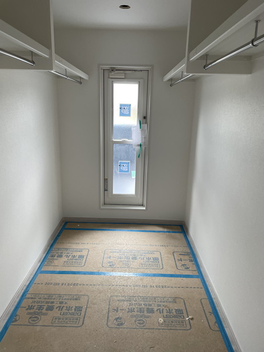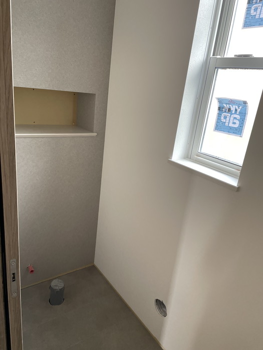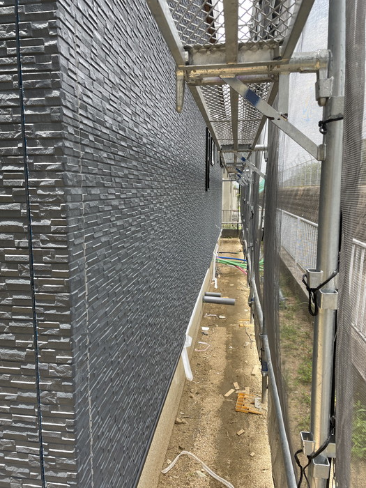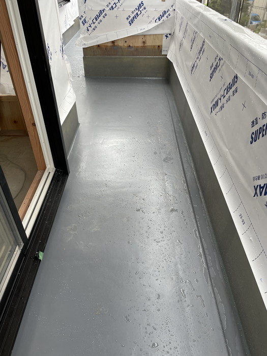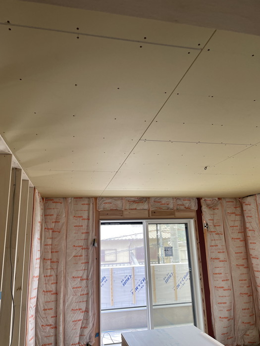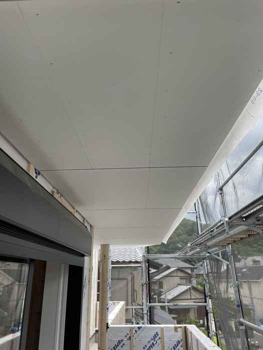 天井ボード張り、バルコニー上軒天、サイディング施工を行いました。