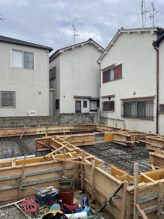 配筋が図面通りに施工されているか検査(配筋検査)を行い、その後、コンクリートの打設を行います。