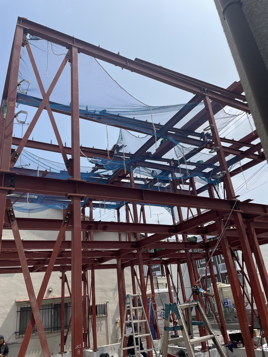 鉄骨(柱・梁など)を現場で組み立てる工事のことです。