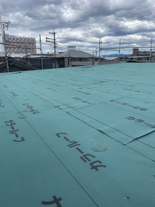 屋根材(瓦やスレート、金属屋根など)の下に敷かれ、万が一屋根材に隙間や破損があった場合でも、水が屋内に漏れないように防ぐ効果があります。