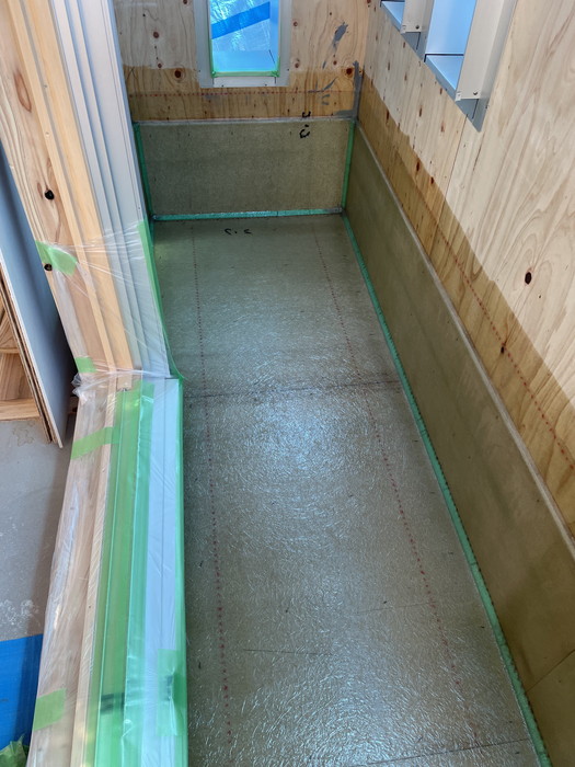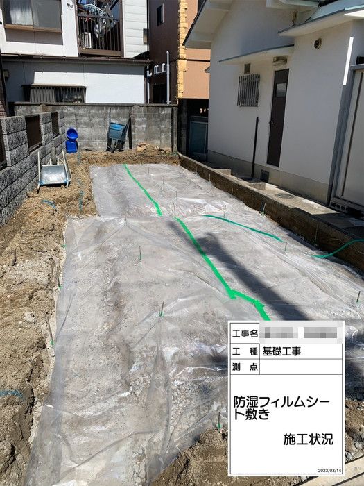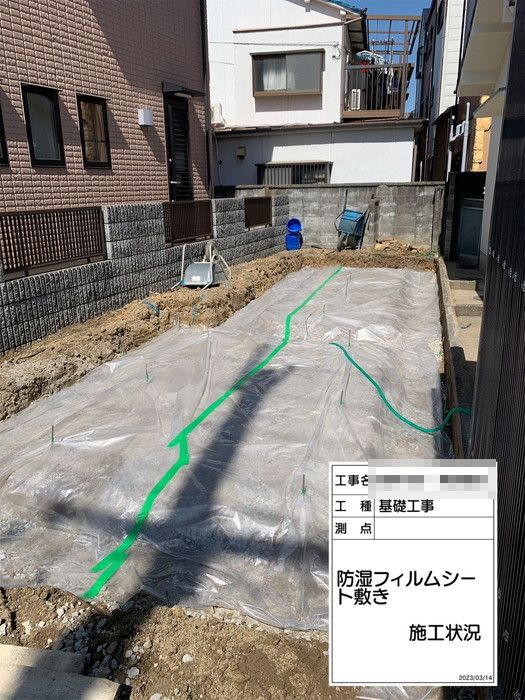防湿シートを敷き詰めた後に、捨てコンクリート(略して捨てコン)の打設を行いました。