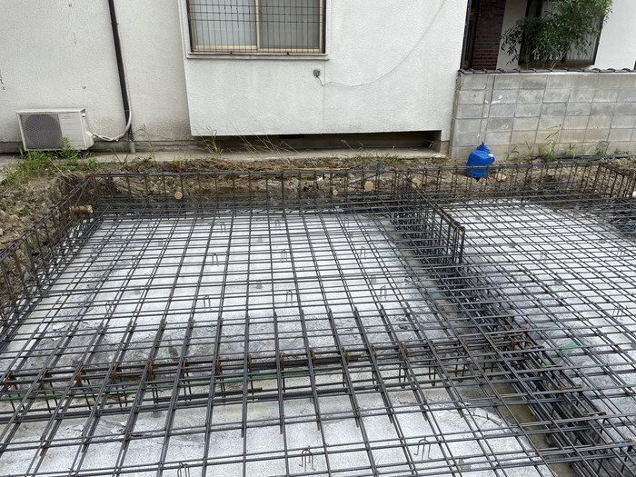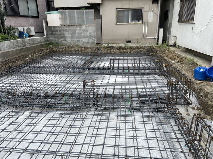 基礎配筋工事を行いました。べた基礎のダブル配筋になっていますので、とても丈夫です。