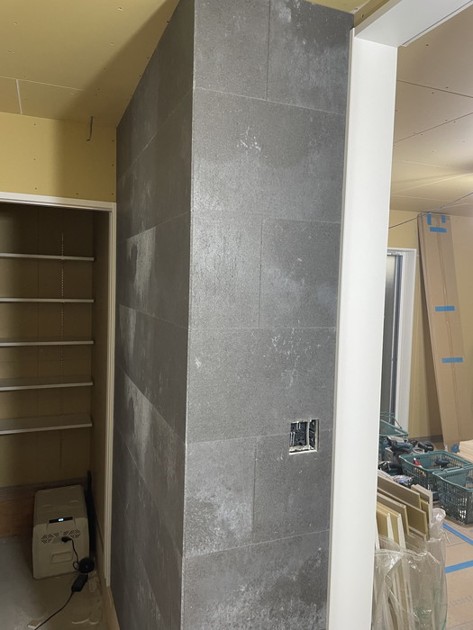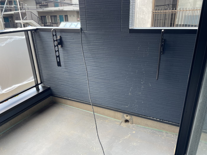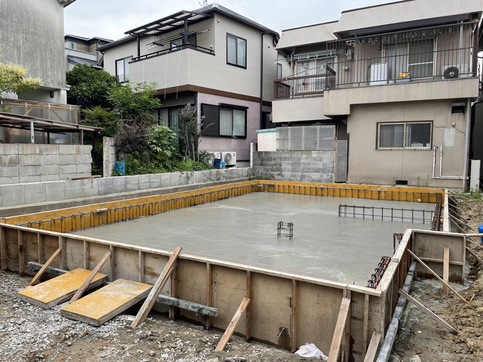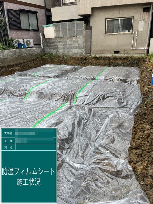 防湿シートを敷き詰めた後に、捨てコンクリート(略して捨てコン)の打設を行いました。