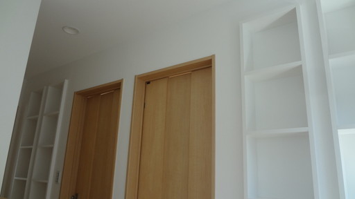 収納を重視した狭小地に建つお家がほぼ出来上がりました。1階の納戸には可動棚やハンガーパイプを取り付け、収納力を高めました。 各階も多くの床下収納やロフトによりスッキリ整理整頓を可能にしました。また真っ白な本棚は収納面だけでなく、お気に入りの小物やインテリアを飾っていただくのにもピッタリです。