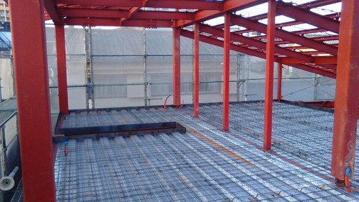 ・建築物のコンクリートで覆われたものの中に入る骨組みとなる鉄筋を網目状に組んでいきます。