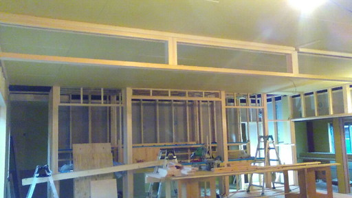 ・吹付断熱工事です。白いモコモコしたものが断熱材です。