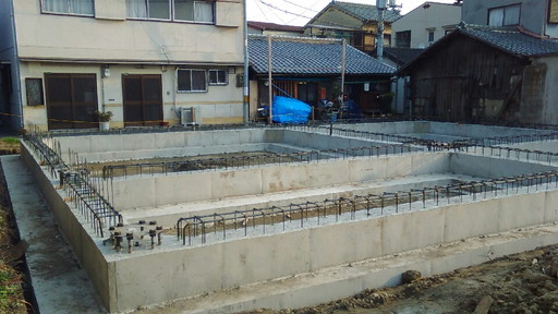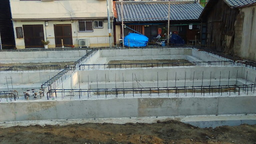 こちらの写真は通称「捨コン」と呼ばれるものです。地面からの湿気を建物に上げない様にシャットアウトするためのシートを敷き、コンクリートで固定します。