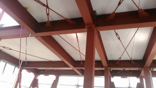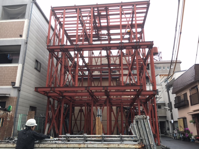 基礎工事が完了し、鉄骨上棟しました。鉄骨を慎重にクレーンで吊り上げ、ハイテンションボルトでしっかりと締めつけました。