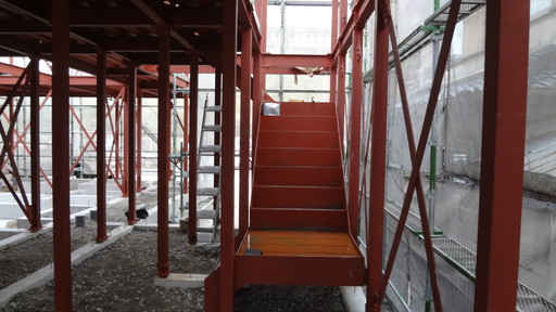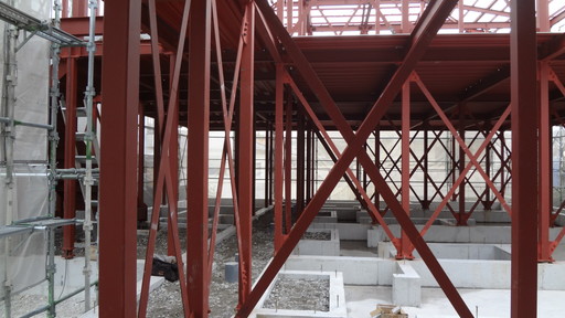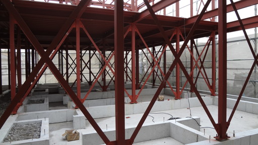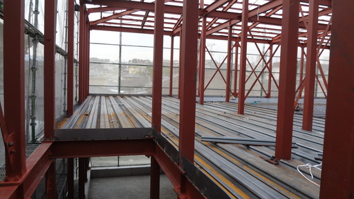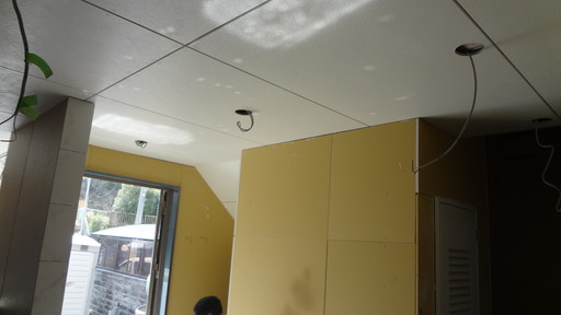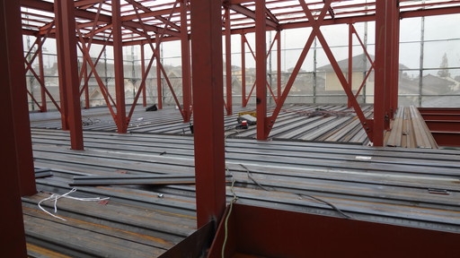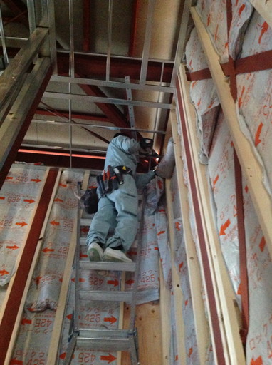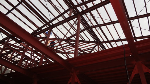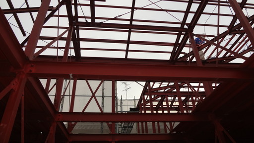 断熱工事も終わり、天井・間仕切り壁の軽鉄下地組の工事の様子です。