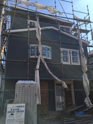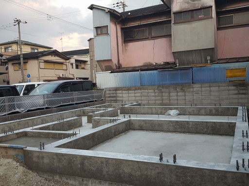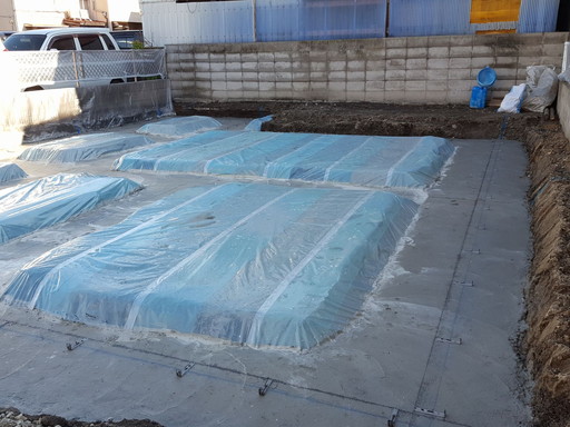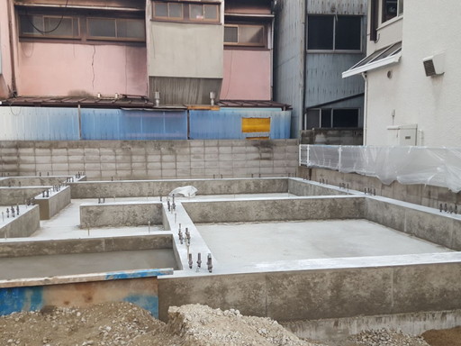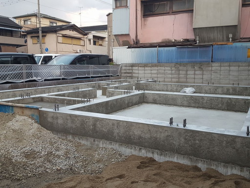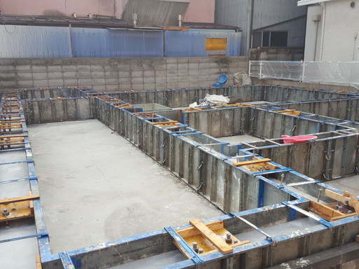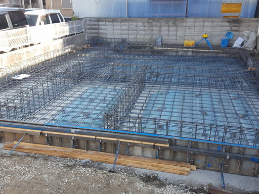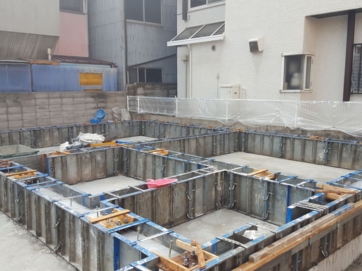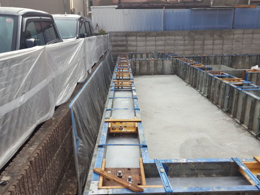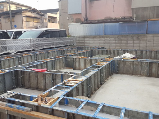 基礎型枠工事です。コンクリートを打設し、基礎立上り型枠を組み、その型枠に生コンを流し込みました。