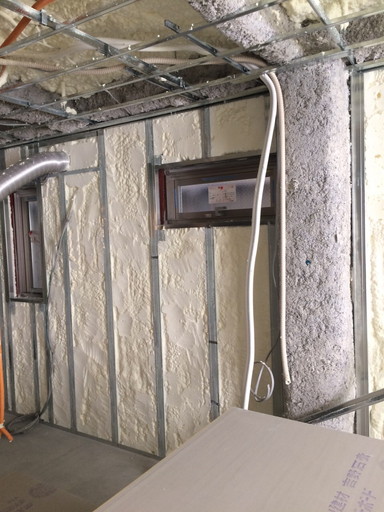 白いモコモコしたものが断熱材、現場発泡硬質ウレタンフォームです。
