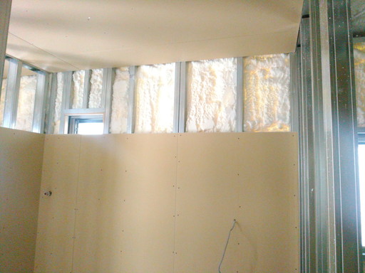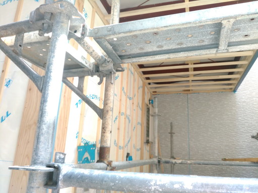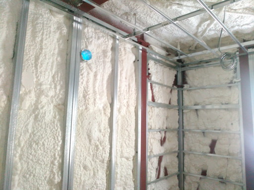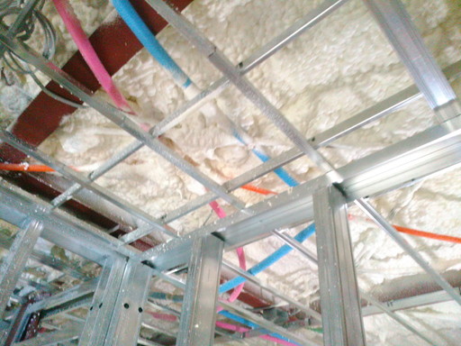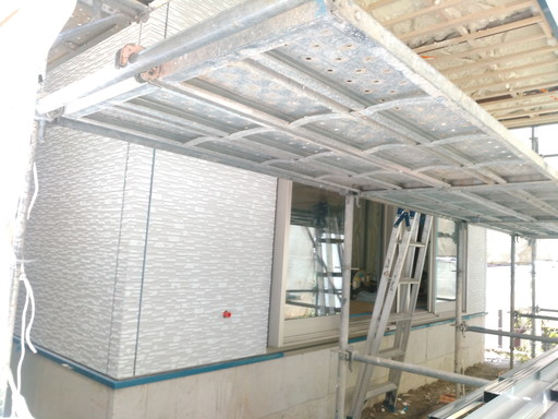 吹付断熱工事を行いました。白いモコモコしたものが断熱材、現場発泡硬質ウレタンフォームです。 スプレー断熱工法によって家をすっぽり包むため気密性が高く、隙間風による冷暖房効果の低下が少ないです。