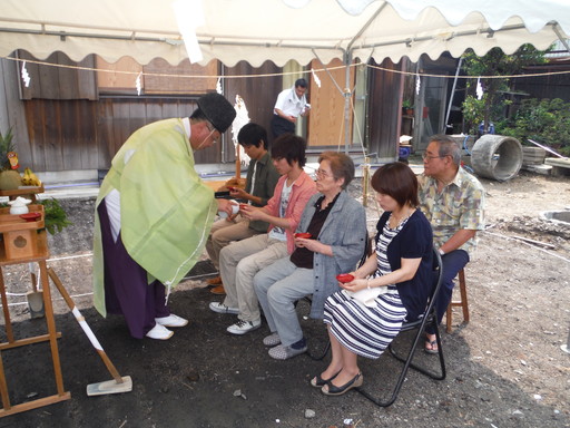 土地を祝い鎮め、工事の安全と家の繁栄を祈願いたしました。神主さんによる清祓いの写真と地鎮の儀の写真です。 最後に、お迎えした神様にお帰りいただき、地鎮祭は終了。神様にお供えした御神酒の御下がりを食します。