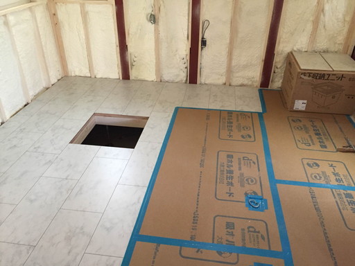 吹付断熱工事を行いました。白いモコモコしたものが断熱材、現場発泡硬質ウレタンフォームです。