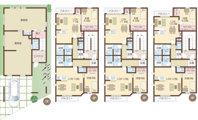 | 建物面積 | 358.95㎡(約108.58坪) 1階/95.07㎡ 2階/88.45㎡ 3階/88.45㎡ 4階/86.98㎡ |
